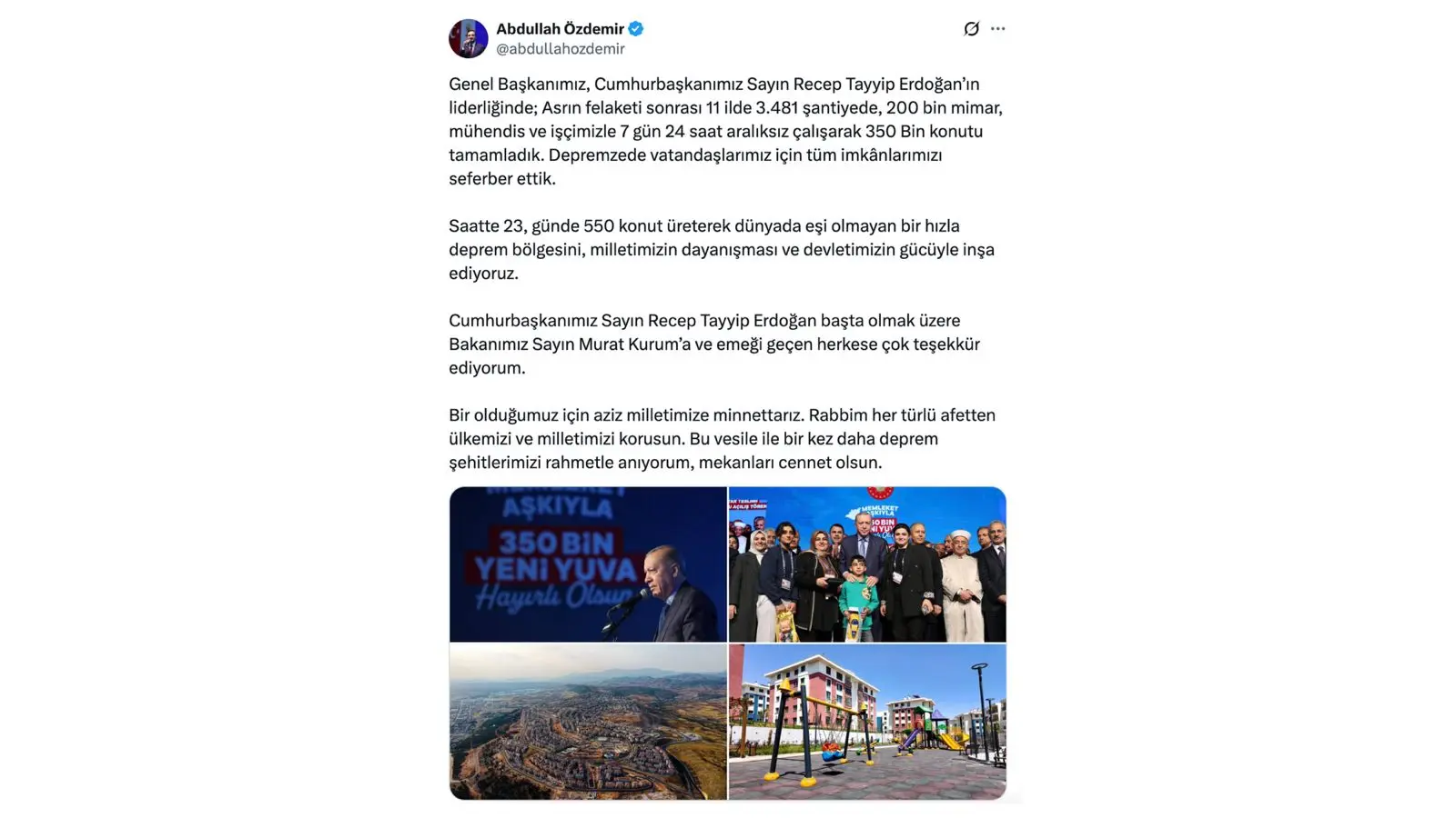 “Asrın felaketi sonrası 11 ilde 3.481 şantiyede, 200 bin mimar, mühendis ve işçimizle 7 gün 24 saat aralıksız çalışarak 350 Bin konutu tamamladık. Depremzede vatandaşlarımız için tüm imkânlarımızı seferber ettik. Saatte 23, günde 550 konut üreterek dünyada eşi olmayan bir hızla deprem bölgesini milletimizin dayanışması ve devletimizin gücüyle inşa ediyoruz.