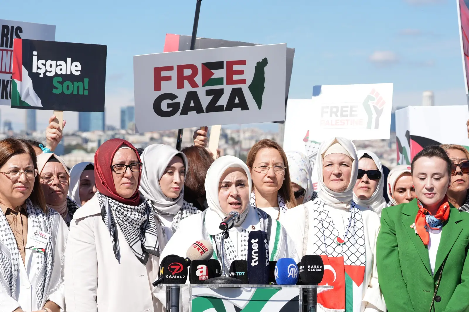 Yaşanan zulme tepki gösteren Kadın Kolları Başkanımız Ercan, “Biz bugün bütün kimliklerimizden sıyrılarak; sadece kadın kimliğimizle buradayız. Çünkü bu mesele ne dünyadaki rollerimizle, ne taşıdığımız unvanlarla, ne de sahip olduklarımızla ilgilidir; bu mesele insanlık meselesidir. Bugün Türkiye’den tüm dünyaya tek bir şey söylüyoruz: Barış kadınla mümkündür.  Slogan atmıyoruz; vicdanlarımızla haykırıyoruz. Çünkü bazı sessizlikler vardır ki, arşı yere indirir. Ve bizim sessizliğimiz, Gazze’nin en gür çığlığı olacaktır.” ifadelerini kullandı.